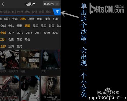 点击图中箭头所示的小沙漏,会出现一个更加详细的频道分类,我把他们归纳成四个分类:属性分类,地区分类,年代分类,正片分类和超清或蓝光分类,不同种类可相互重叠,例如:恐怖/韩国,包含了属性分类和地区分类。但是同样分类是不可重叠的,例如:恐怖/悬疑,只包含了属性分类,这样是不能进行操作的