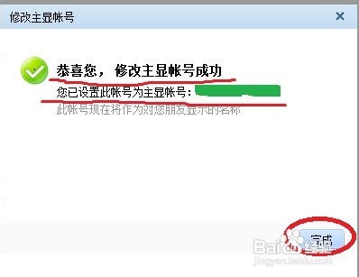 5、点击后你会看见修改主显账号方框里面显示:恭喜你,修改主显账号成功,那么说明你的设置成功了。然后按完成就行。
