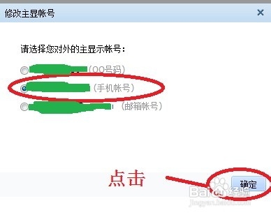 4、点击后你会看见它弹出一个修改主显账号方框,上面会显示几个号码,然后根据你的喜好,选择一个你喜欢的号码修改。比如我选择手机账号,那么你要点击手机账号那个方框。选择后,点击确定。