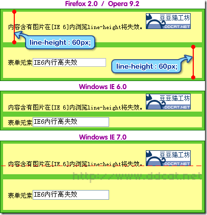<div id=”lineHeight4″> <p>内容含有图片在[IE 6]内浏览line-height将失效。<img src=http://www.bitscn.com/school/HTMLCSS/201412/”../../img/ddcat_anim.gif” _fcksavedurl="”../../img/ddcat_anim.gif”" _fcksavedurl="”../../img/ddcat_anim.gif”" alt=”图片” width=”88″ height=”31″ /></p> <form id=”testForm” action=”#”> <fieldset> <p><label for=”test1″>表单元素</label>< input type=”text” maxlength=”16″ value=”IE6内行高失效” /></p> </fieldset> </form> </div>