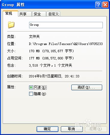 2、然后,鼠标右键单击“Group”文件夹,进入“属性”设置。我截图用的QQ版本是6.3(12382),如果是低版本的QQ可能没有这个文件夹,那么就需要先升级一下QQ。这个文件夹里存放的正是所有QQ群接收的图片。