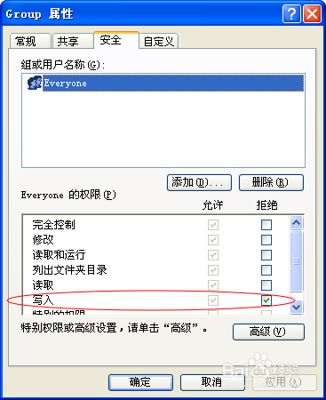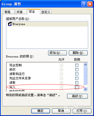 3、点击进入“安全”选项卡,如图所示勾选,表示拒绝在"Group"这个文件夹中放入图片。如果要取消操作,则取消勾选即可。
