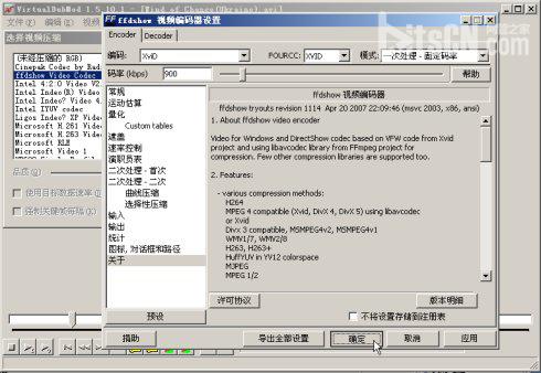 添加完字幕后,回到初始界面,点击“视频”,再点击“压缩”。在自动出现的对话框中,选中左边白色框中的“ffdshow Video Codec”,再点击右边的“配置”。在自动出现的对话框中,点击“编码”处的“向下的箭头”,在下拉菜单中选中“XviD”。要安装了前面提到的“ FinalCodecs”(终极解码)才会在这里出现“XviD”,XviD是这个下拉菜单中使视频最清晰的编码器。