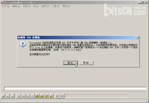VirtualDubMod:“文件 -> 打开视频文件”,找到要处理文件,双击如果出现下面情况说明使用了VBR的Mp3音频,一定要选“否”,选“是”会影音出现不同步。