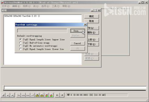 前面之所以把textsub.vdf移动到VirtualDubMod文件夹中的“PlugIns”文件夹中,就是为了在这里出现“TextSub 2.23”的选项。我压制的时候移动过来这里也没出现,点击“加载”,再从弹出来的对话框中找到硬盘中的textsub.vdf并将其选定。如果还不行的话,就加载vsfilter.dll(在Vobsub文件夹里)。