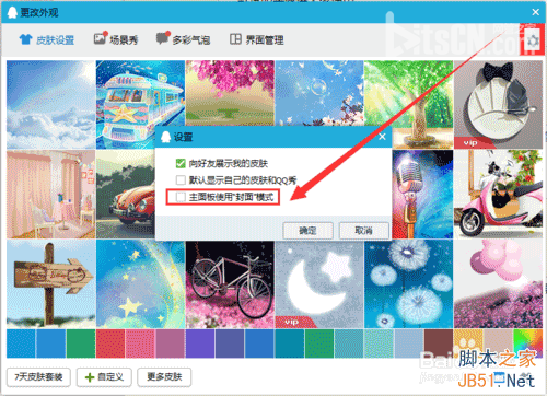 4、切换QQ主界面为“经典模式”的方法,点击QQ主界面中的“更改外观”按钮,在打开的窗口中点击右上角的“设置”按钮,并在弹出的窗口中清除“主面板使用‘封面’模式”项,点击“确定”即可。
