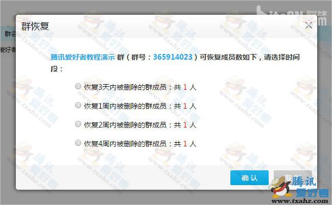 5、随便选择一个选项恢复群成员,然后点击确定。如下图: