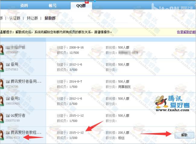 2、创建后我们可以看到是200人群(群号365914023),再点击“解散”该群。如下图: