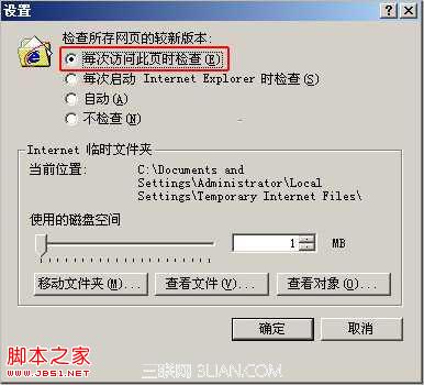 第二步:点击“设置”按钮,出现如下画面,将“检查所存网页的较新版本”设置为“每次访问此页时检查(E)”,然后按“确定”按钮。