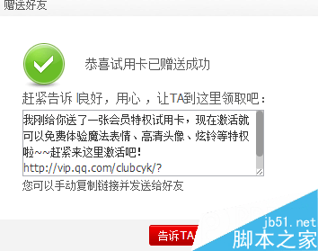 4、会员试用卡已赠送成功,将连接复制给你的好友,让他在这里激活即可成功体验7天会员哦!