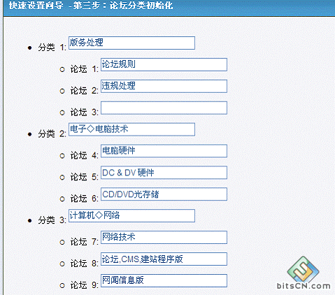 此处将对论坛的版块进行设置,方法很简单,在“分类1”、“分类2”、“分类3”中填写的将是论坛版块的大类名称,而每个分类下的“论坛1”、“论坛2”等,则是具体的论坛版块名称。