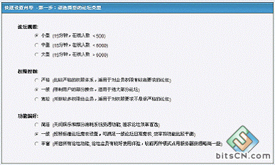 论坛类型的设置中包括“论坛规模”、“权限控制”、“功能偏好”三大项。针对目前国内虚拟主机的情况,笔者建议将“论坛规模”设置为“小型”;“权限控制”设置为“一般”;“功能偏好”则设置为“一般”,以便所建立的论坛能够以最佳状态运行(如图4)。