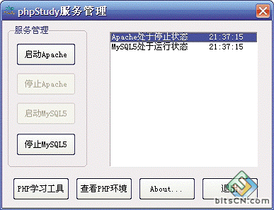 完成安装后,启动“phpStudy服务管理”程序,将可查看Apache与MySQL运行状态(如图1)。需要指出的是,如果系统中安装有IIS,并且处于启动状态,那么80端口将被占据,从而导致Apache无法启动。要启动Apache,需要先将IIS关闭,或者将IIS的端口改为非80端口。