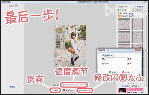 最后,在“闪图 编辑框”内调节闪图的飘落速度、闪图大小后选择“保存”图片即可。