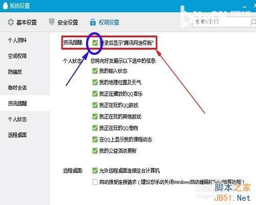 5、进入“资讯提醒”界面后,在界面上方我们可以看到“登录后显示‘腾讯网’迷你版”前面绿色方框中有对勾符号,这是软件的默认设置,此时只需在绿色方框里单击一下将对号选中取消即可完成设置如下图蓝色椭圆选中处。