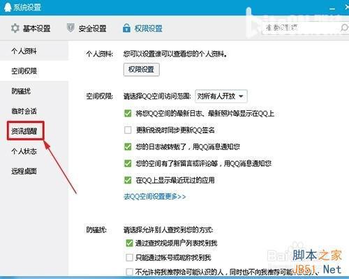 4、进入“权限设置”界面后,在界面左侧找到“资讯提醒”选项如下图红色框选中位置,单击“资讯提醒”等待进入其设置界面。