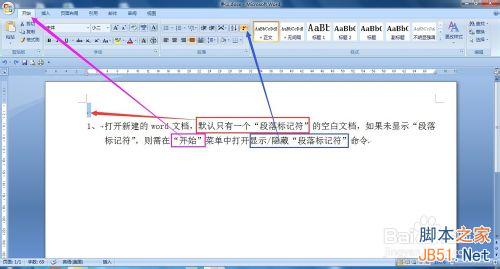 打开新建的word文档,默认只有一个“段落标记符”的空白文档,如果未显示“段落标记符”,则需在“开始”菜单中打开显示/隐藏“段落标记符”命令。