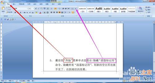 最后在“开始”菜单中点击显示/隐藏“段落标记符”命令,隐藏所有“段落标记符”,则新的空白页也就不见了。达到相应的效果。以后在进行打印时再也不用担心会打印出空白页出来了。