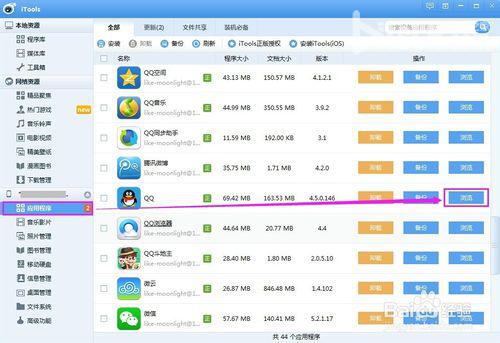 点击左侧的【应用程序】,在右侧找到QQ,然后点击最后面的【浏览】按钮