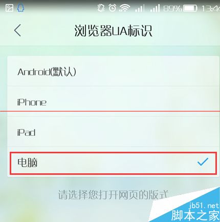 2、找到浏览器UA标识,选择【电脑】