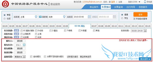 还有那个不怎么起眼的“更多选项”。展开后,用户可以输入优先的车次和席别(最多可选5个优先席别)、备选日期(最多可选5个备选日期),以及选择是否自动提交筛选后的票务信息。