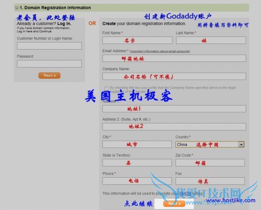 5、然后是提示域名注册信息的页面,之前有Godaddy账号,可以在左边直接登录,如果没有,在右边填写资料,即可注册