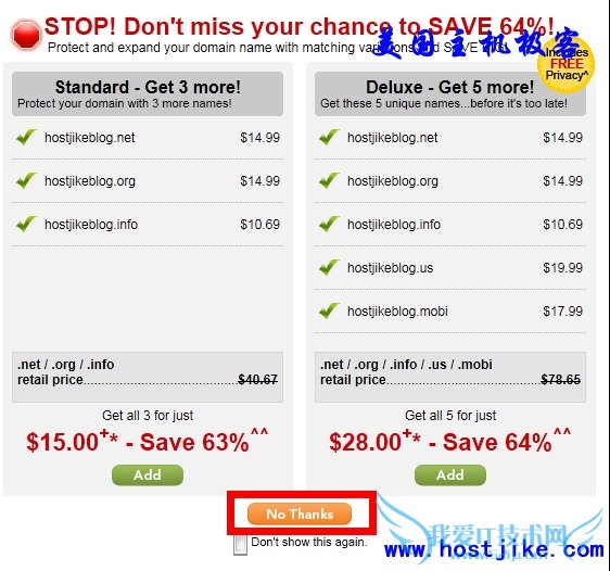 4、在弹出的窗口中(如果不需要注册其他相关域名)点击 No Thanks