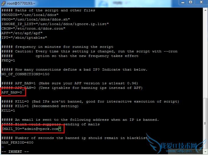 这里主要是APF_BAN=1修改为0(使用iptables),另外EMAIL_TO=”root”可以将root修改为你的一个Email地址,这样系统办掉哪个IP,会有邮件提示你。