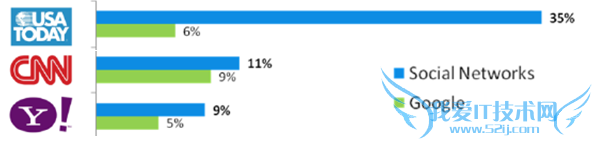 上图是几个新闻类的网站的流量数据对比。根据国外Compete的研究数据,在某些网站上,SMO(社会化媒体优化)的流量已经超过了SEO的流量。这一趋势已经在国外开始发生,相信不久的将来,在国内也会呈现极大的优势体现。