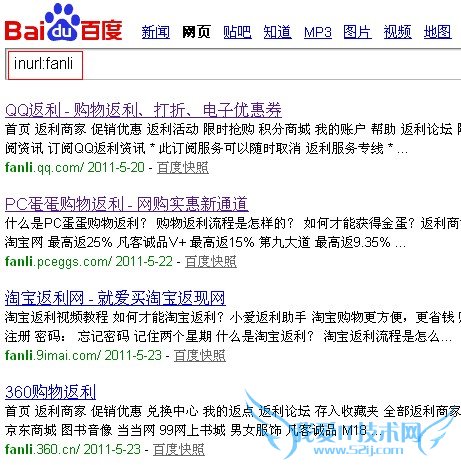 2、使用inurl:关键词:上面的方法是通过搜索引擎检索网站包含的关键词,但是那样寻找虽然能达到“全”的目的,但是很难达到“快”的效率,所以直接百度“inurl:fanli”这一短语就会检索出大量返利网站