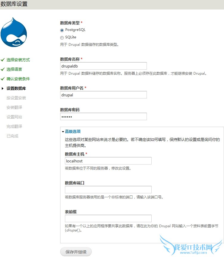 ③、选择PostgreSQL,数据库名称drupaldb,用户名drupal,密码输入上面创建drupal用户时的密码