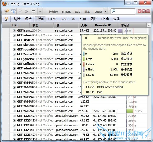 这里推荐使用火狐的Firefbug或者谷歌浏览器的开发人员工具(F12),这里以firebug为例,装好firebug后,在打开firebug的情况下,刷新你的网站页面,如图: