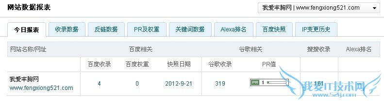 看完概要了,就可以点击左边的导航栏看网站的详细数据了。详细数据里边有网站收录数据、反链数据、pr及权重、关键词排名数据、alexa排名、百度快照、ip变更历史。