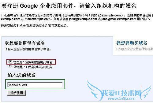 2. 选择“管理员:我拥有如果你已经有了域名“后,输入你的域名,点击“开始使用”,进入下一步;PS:如果没有域名,赶紧申请吧。