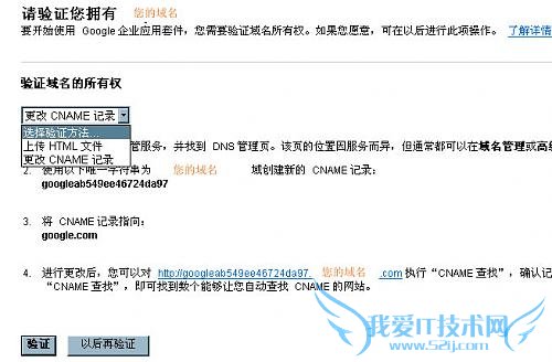 如果你还没有空间,就用CName方法。只需要在域名解析的时候把google给的相应的字符串创建cname记录并指向google.com。