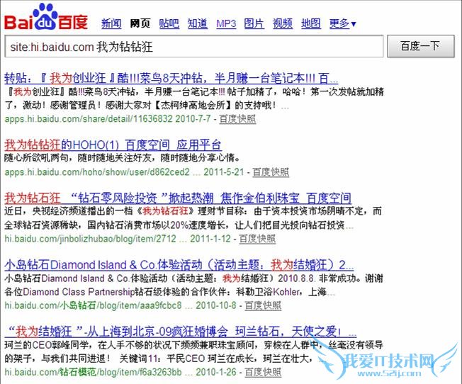 我当初注册百度空间时用的中文注册名“我为钻钻狂”,于是百度给的空间博客域名便是http://hi.baidu.com/我为钻钻狂,按照以上的方法,我们应该这样查询:site:hi.baidu.com 我为钻钻狂,可是结果是杯具的一篇收录也没有。为什么会这个样子,你可以看看你的中文博客浏览器的地址栏便会发现,那里显示的地址已经将中文解析成了一串乱码,哪怕是收录了你的文章,地址也会是hi.baidu.com/乱码/文章页,而不会是hi.baidu.com/中文注册名/文章页。看到这里,有人会想,那么我查询的时候用乱码代替中文注册名不就好了?我也是这么想,可是同样查询不到有收录。于是我猜测,由于中文注册名被解析成了乱码的缘故,会不会被百度认为是不友好的动态地址而不给收录呢?哪怕是百度自己的产品也是毫不留情。