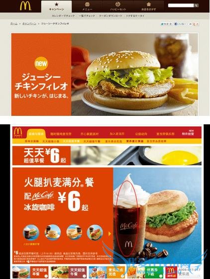 如图所示,一个日本麦当劳网站和一个中国的麦当劳网站。最明显的区别是没有什么大的Mac和可乐,只有一个鸡肉汉堡,这对于西方观众而言可能看起来非常奇怪,但在日本,这种情况是非常普遍的,从日本当地的饮食习惯而言,只有这样才是他们所认为的“健康饮食”。