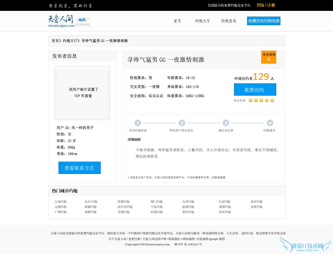 2.点对点模式完美解决隐私问题。发布者发布约炮信息,异性用户申请应约。发布者在查看应约者信息之后选定应约者。选定之后约炮成功。应约者可以点击查看发布者留下的联系方式。也就是说发布者的联系方式会100%到达到自己指定的约炮者上。信息得到充分的保护。