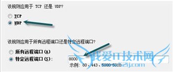 然后按要求选择TCP还是UDP,这里我们选择UDP。然后选择特定远程端口,在下面输入8000。