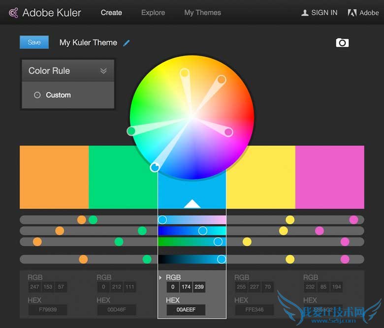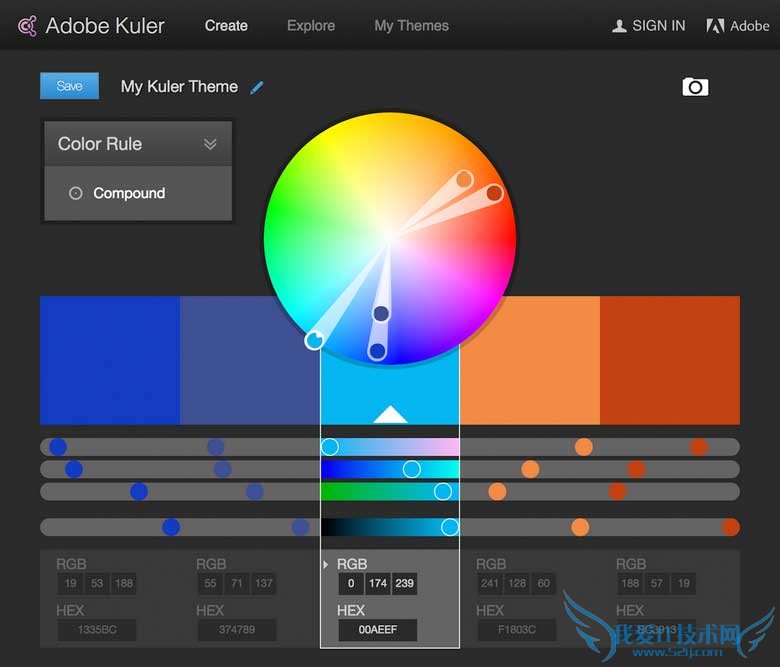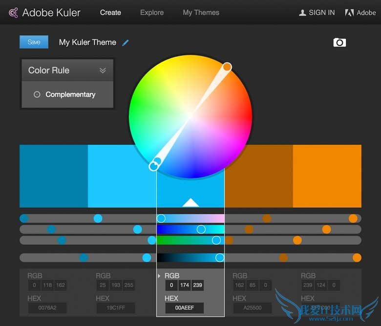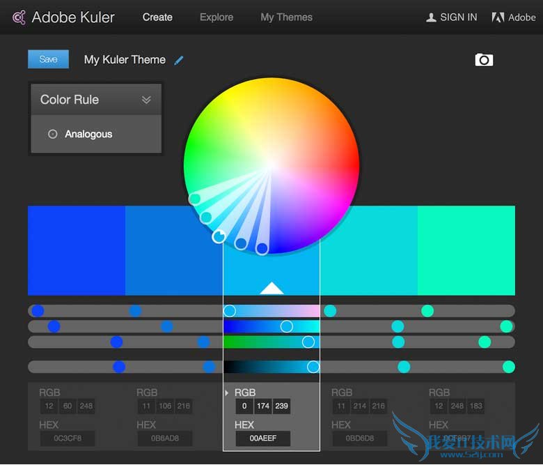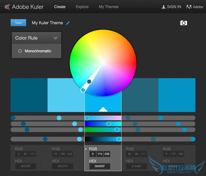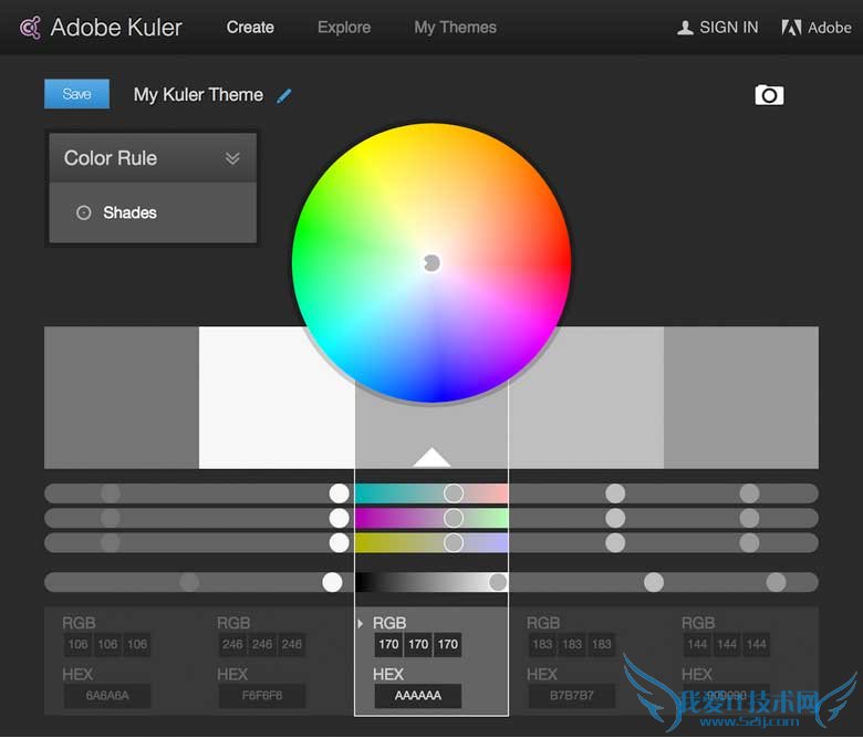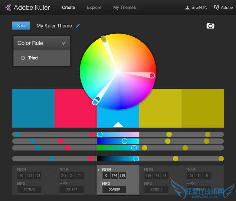 传统意义上的色轮通常是印刷出来的2~3个纸质环形构成的,中间被固定住,可以旋转。Adobe的网站Kuler就为你提供了一个不错的在线版本,并且还能帮你配色。另外一个在线色轮网站是Colorhexa.com,也是不错的选择。