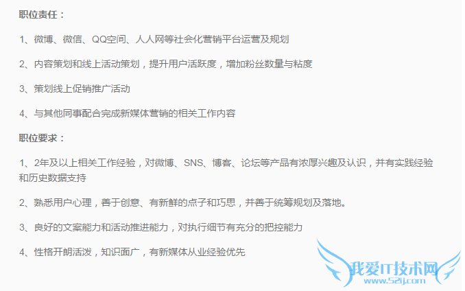 了解了这些职位之后呢,你可以从新选择一个你最有意向的1到2个职位,然后就搜索进去看里面的工作内容了。我以新媒体运营岗位来举例说一下,我随意的进了一个之后,它的职位责任和职位要求是这么写的: