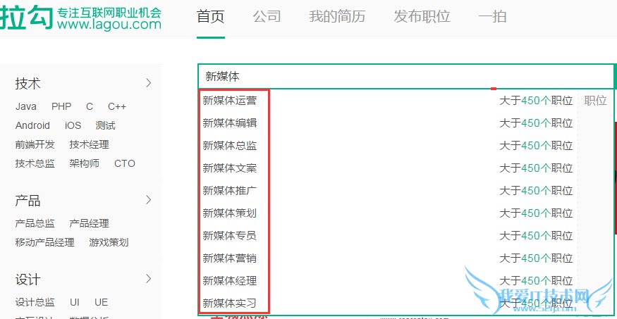 先了解一下新媒体相关的工作岗位有哪些吧?怎么了解呢?我以拉钩网举例,它是专门做互联网职业招聘的。打开拉钩网,然后输入关键词“新媒体”三个字,下面的下拉框会出现新媒体运营,新媒体编辑,新媒体营销..........。都是大于450的,说明这个职位的需求还是蛮大的。