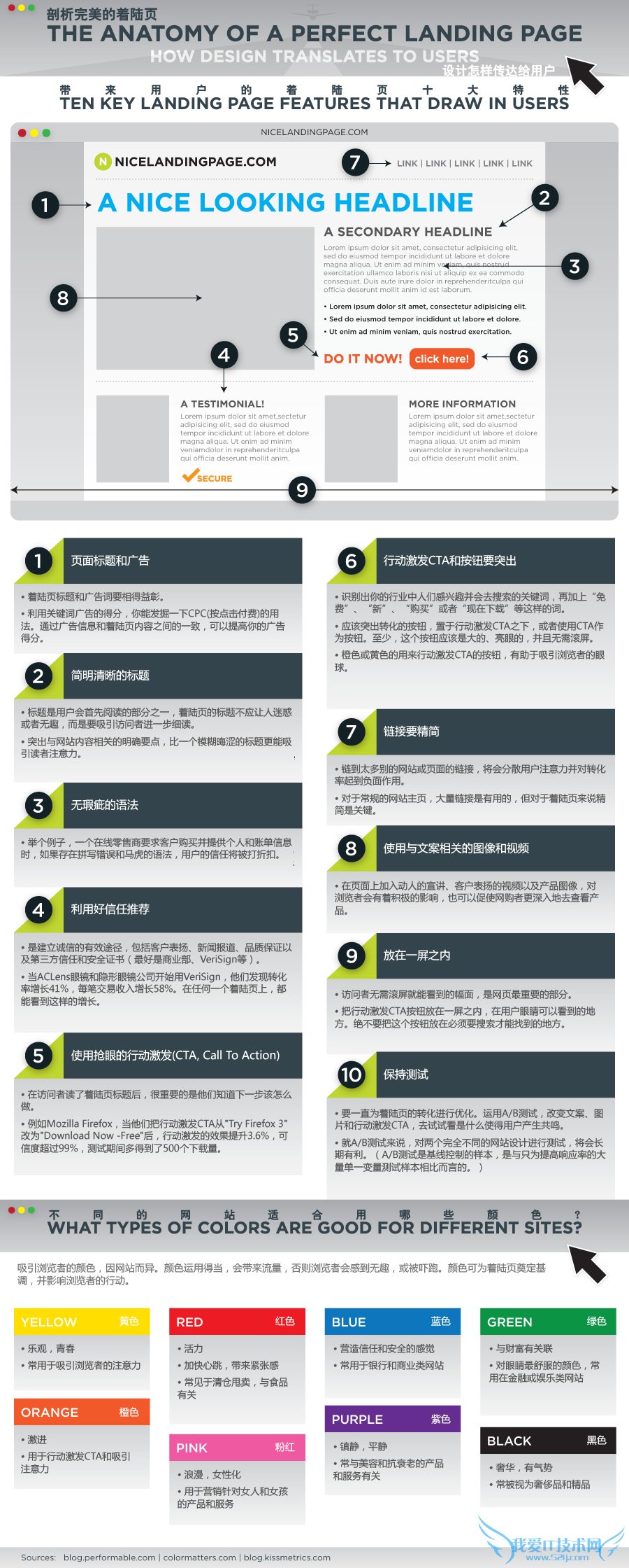 下面这张图片,将剖析完美的着陆页应具有的十大特征,从而帮助你更好的了解着陆页、设计制作着陆页,吸引更多的用户点击内容或者广告。(请点击查看大图)
