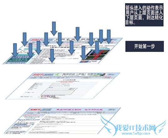入口页在转化流程中占据了重要的地位,具有承上启下的作用,很多中小网站的入口页面就是首页。有朋友可能会问,那入口页和主页有什么区别呢?打个比方,网站就是个有很多门的建筑,主页就是大门,入口页指的是这栋建筑里所有门。一个网站的主页体现网站类型、宗旨以及重点内容,要针对网站级别的主要流量进行设计;而入口页的内容是要针对所有流量,即任何网络推广(付费或非付费)带来的流量都要照顾到。如前文所述大多数的网络推广都是为了最后的转化,经过某个入口页完成的转化越多,说明这个入口页越有利于转化,越匹配它的推广来源流量。