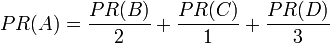 继续假设B也有链接到C,并且D也有链接到包括A的3个页面。一个页面不能投票2次。所以B给每个页面半票。以同样的逻辑,D投出的票只有三分之一算到了A的PageRank上。