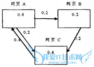 现在假设只有四张网页集合:A、B、C,其抽象结构如下图1: