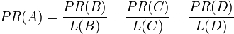如果网页T存在一个指向网页A的连接,则表明T的所有者认为A比较重要,从而把T的一部分重要性得分赋予A。这个重要性得分值为:PR(T)/L(T)