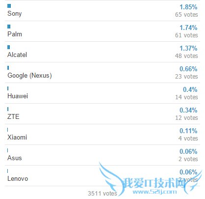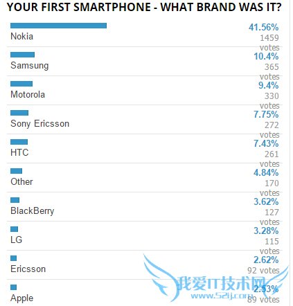 说到三星,这家韩国公司获得了365票,以10.4%的得票率排在第二。第三到第五位的分别是摩托罗拉、索尼爱立信以及HTC,得票率分别为9.4%、7.75%和7.43%。目前的智能手机巨头苹果在这份榜单中仅获得了2.53%的投票,显示出大多数人购买的首款智能机均非iPhone——至少在这份榜单中如此。(编译/昷凡)