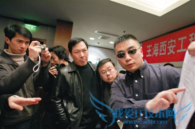 2005年2月28日,戴着一副标志性墨镜的王海现身西安某酒店召开新闻发布会。图/CFP