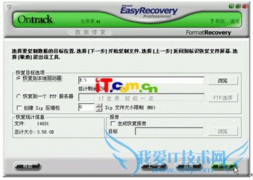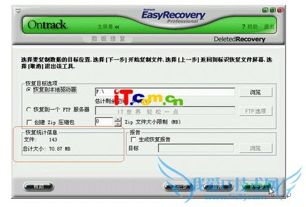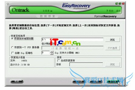 接下来的就是让你选择备份盘的窗口了。你可以将想要恢复的数据备份到你的硬盘里面,也可以选择放置在文件夹里面,或者备份到一个FTP服务器上面,还可以将数据统统备份到一个ZIP压缩包内。左下方的“恢复文件信息”会提示你恢复文件的数量和大小。提示一下,最好不要将这些要恢复的数据放在你的被删除文件的盘内,比如,你要恢复E盘的数据,那么恢复出来的数据最好不要放在E盘,否则很可能发生错误,导致恢复失败,或者数据不能完全被恢复。做好选择后,单击“下一步”。
